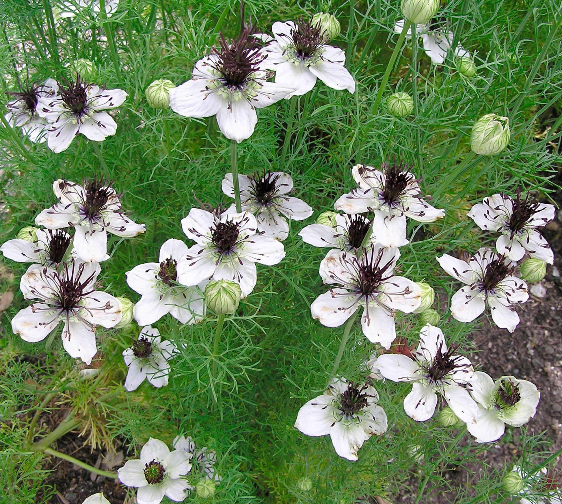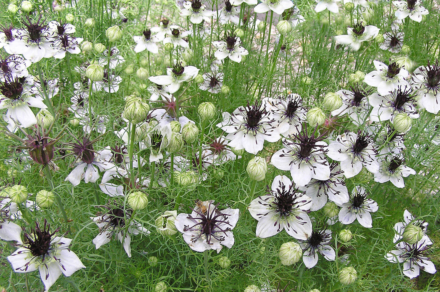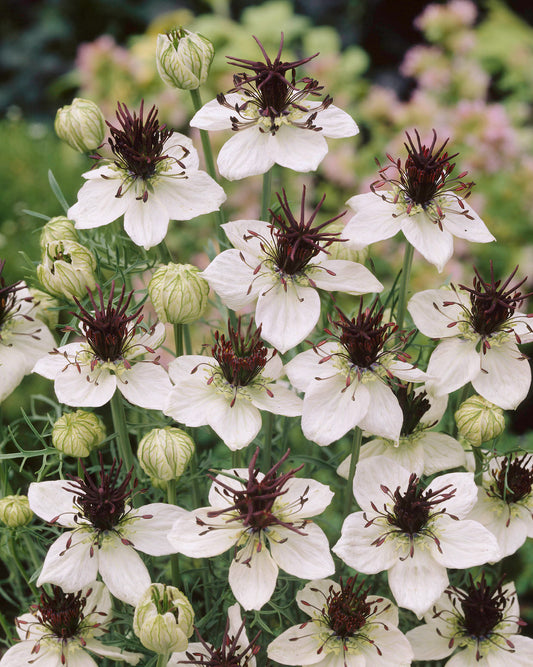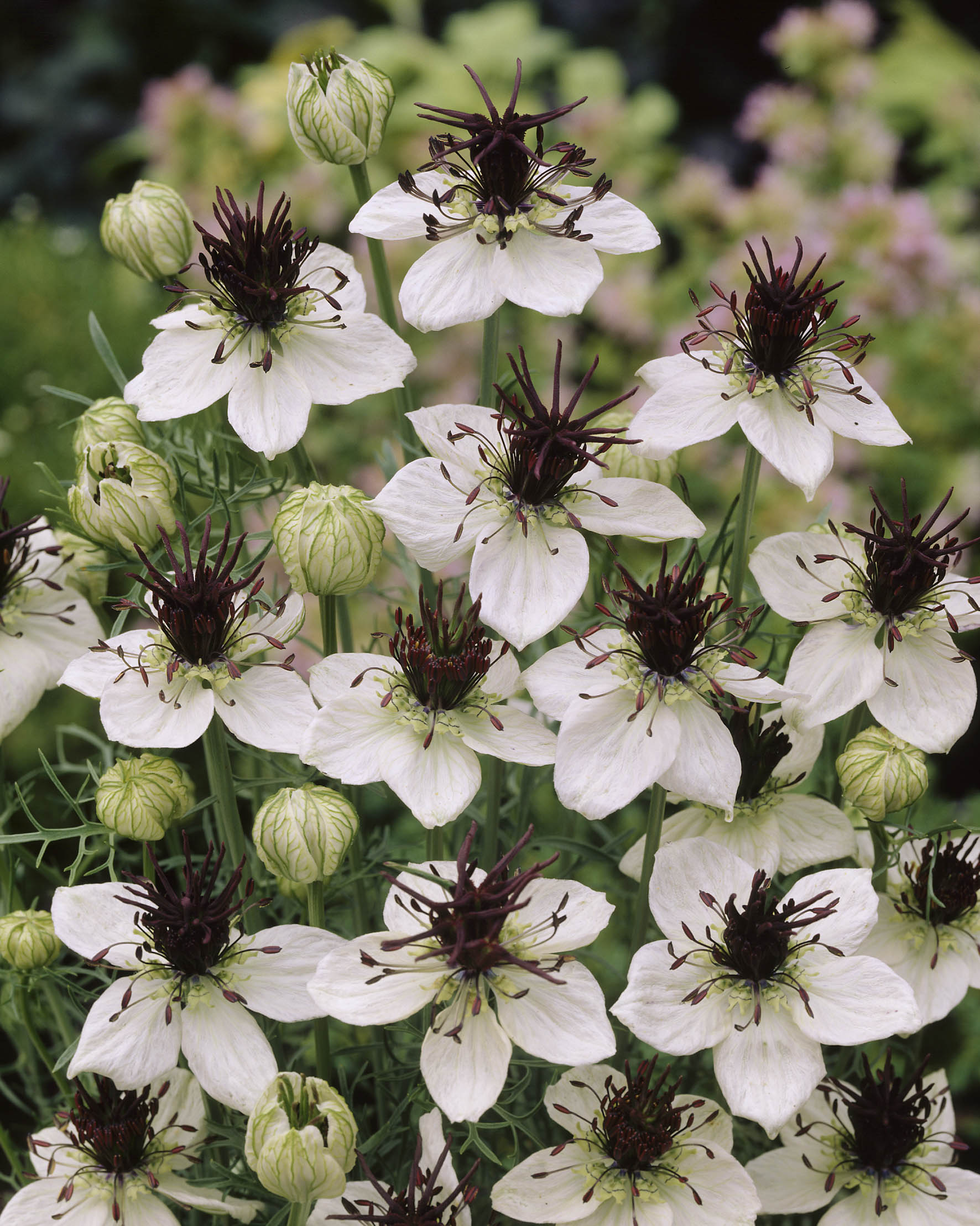 EXCLUSIVE - This hard-to-find nigella has multifaceted 2-inch blossoms with pure white petals and deeply contrasting, striking black centers. These enticing flowers float above ferny green foliage and make good cut flowers for indoor bouquets. When the plentiful white blossoms fade, they are followed by very decorative spidery seedpods that are simple to air dry for handsome everlasting dried flower arrangements. Reliable Nigella is carefree and easy to grow in all climates.