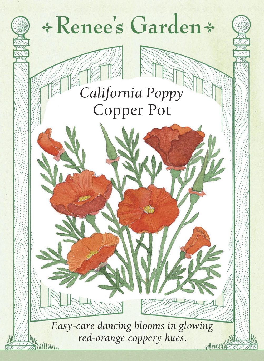 The blossoms of this luminous California poppy glow in radiant coppery-red shades, especially dazzling when lit by the sun. Copper Pot’s satiny flowers shine like bright beacons above mounds of feathery, gray-green foliage. Their vibrant colors are real showstoppers throughout spring and early summer. Ideal for drifts of cheerful color, these easy to grow flowers will often naturalize and happily resow themselves for another season of bloom. Copper Pot is perfect to cover bare or neglected garden areas.