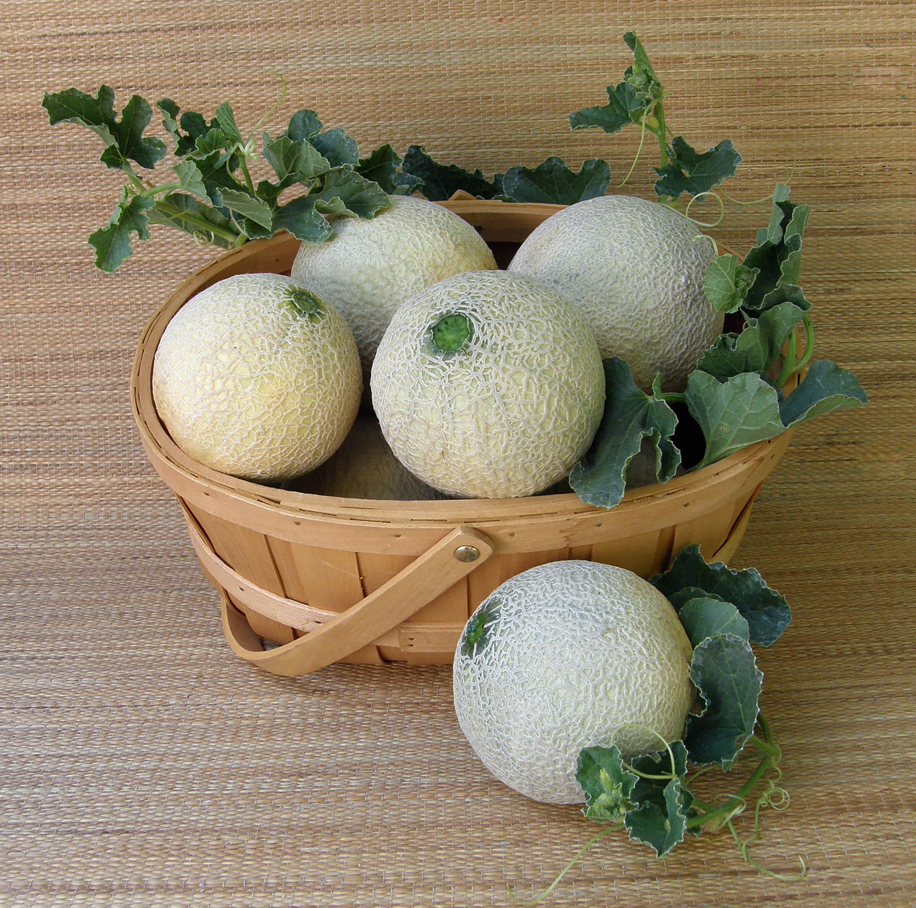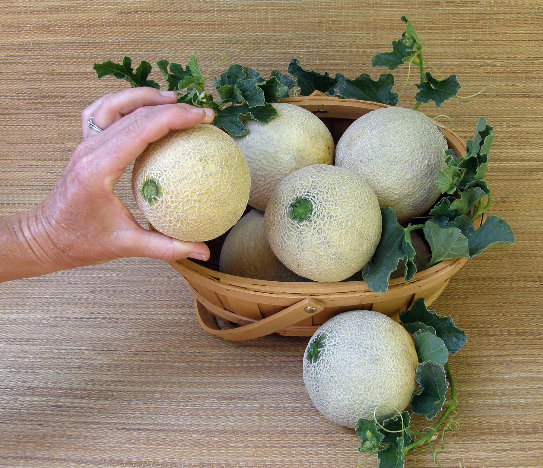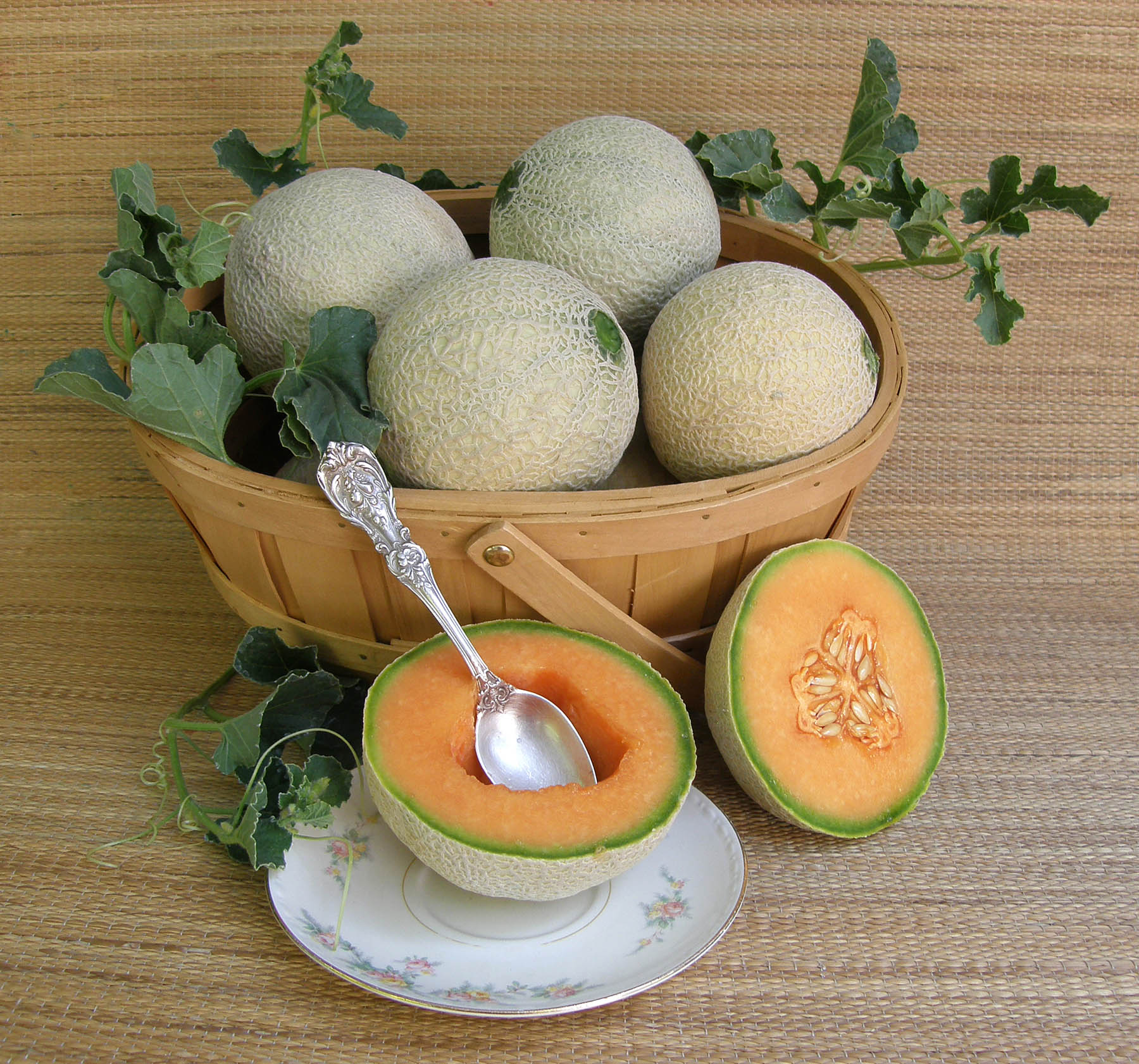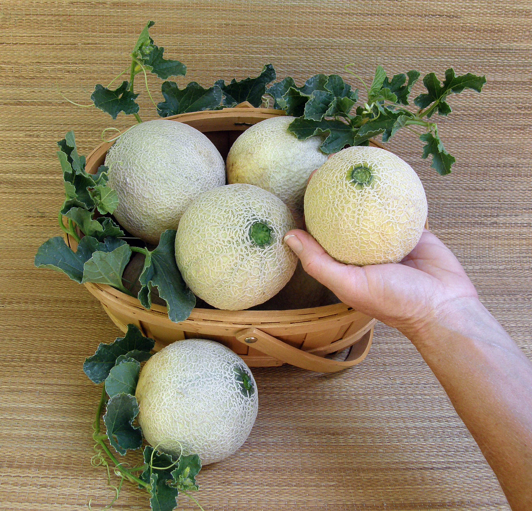 Melons need full sun, rich soil and warm temperatures. Plant only when weather is warm and settled and temperatures stay above 50° (10°C). In rows 4 feet apart, sow groups of 2 to 3 seeds every 2 feet. After germination, thin to the strongest seedling per group, so you end up with one plant every 2 feet. Or make slightly mounded hills, 2 feet in diameter and 5 feet apart, sowing 5 or 6 seeds in each hill. Thin to 3 strongest plants.